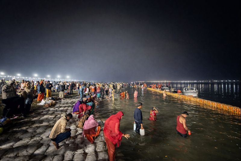 Paush Purnima Magh Mela holy bath at Triveni Sangam Prayagraj with thousands of devotees taking a sacred dip