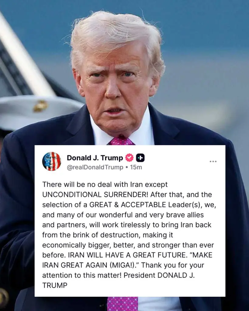पूर्व अमेरिकी राष्ट्रपति डोनाल्ड ट्रंप ने अपने सोशल मीडिया प्लेटफॉर्म Truth Social पर एक पोस्ट साझा किया। Donald Trump statement में उन्होंने कहा कि ईरान के साथ किसी भी समझौते का रास्ता “बिना शर्त सरेंडर” के अलावा नहीं है।