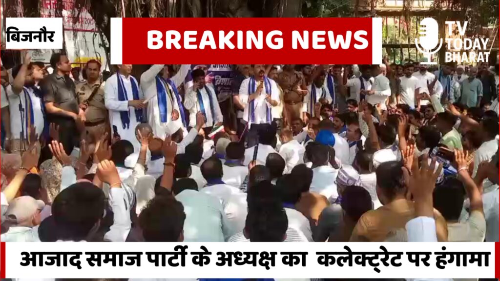 सोमवार को आज़ाद समाज पार्टी के अध्यक्ष और नगीना से सांसद चंद्रशेखर आज़ाद अपने हजारों समर्थकों के साथ बिजनौर कलेक्ट्रेट पहुंचे। उन्होंने प्रशासन की कार्यशैली के खिलाफ जमकर नारेबाज़ी की और परिसर में धरने पर बैठ गए।