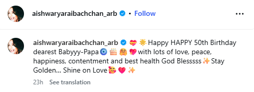 Reading: 50वें जन्मदिन पर ऐश्वर्या राय का खास संदेश, अभिषेक बच्चन को कहा ‘बेबी पापा’