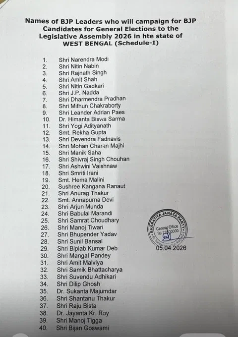 Reading: West Bengal Assembly Election 2026: बीजेपी ने जारी की 40 स्टार प्रचारकों की सूची, मोदी-शाह-योगी करेंगे चुनाव प्रचार