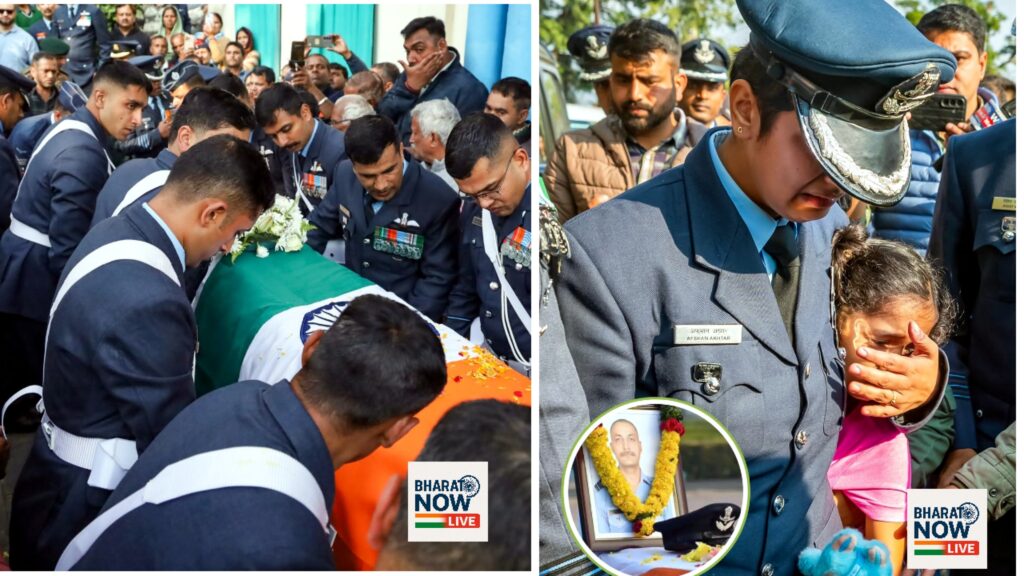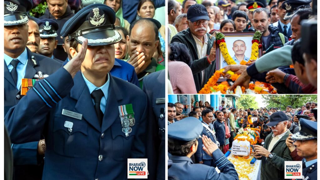 Wing Commander Namansh Syal final salute: कांगड़ा गांव में गहरी सन्नाटा और दुख की लहर थी, जब विंग कमांडर अफशां ने अपने पति, विंग कमांडर नमांश स्याल को अंतिम सलामी दी। वह क्षण सिर्फ एक रस्म नहीं था वह प्रेम, कर्तव्य, और बलिदान का सबसे मौन लेकिन सबसे बुलंद बयान था। कांगड़ा की संकरी गलियां उस दिन शांत थीं इतनी शांत कि मानो हवा तक ठहर गई हो। हर घर, हर चेहरा और हर आंगन पर दुःख का रंग चढ़ा हुआ था। गांव वाले एक-एक करके शहीद नमांश के परिवार के पास पहुंचे, हाथ जोड़कर श्रद्धांजलि दी, मगर शब्द कोई नहीं बोल पाया, क्योंकि कभी-कभी दुःख इतना बड़ा होता है कि शब्द उसके सामने छोटे पड़ जाते हैं।